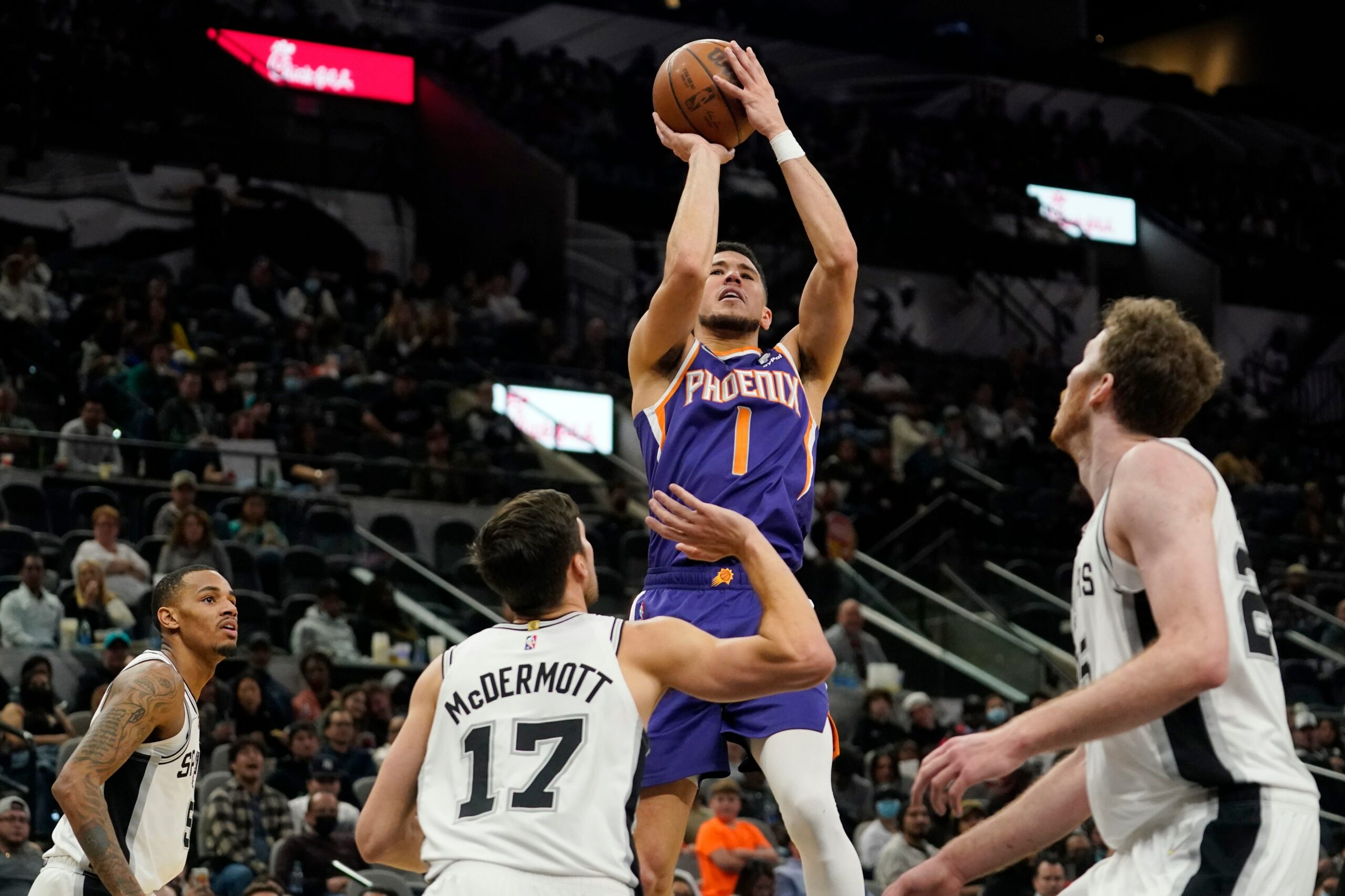 Phoenix arrived in San Antonio after a 135-108 victory in Detroit on Sunday. The Suns started sluggishly against the Spurs, but Booker scored 18 points in the opening quarter to keep the game close.