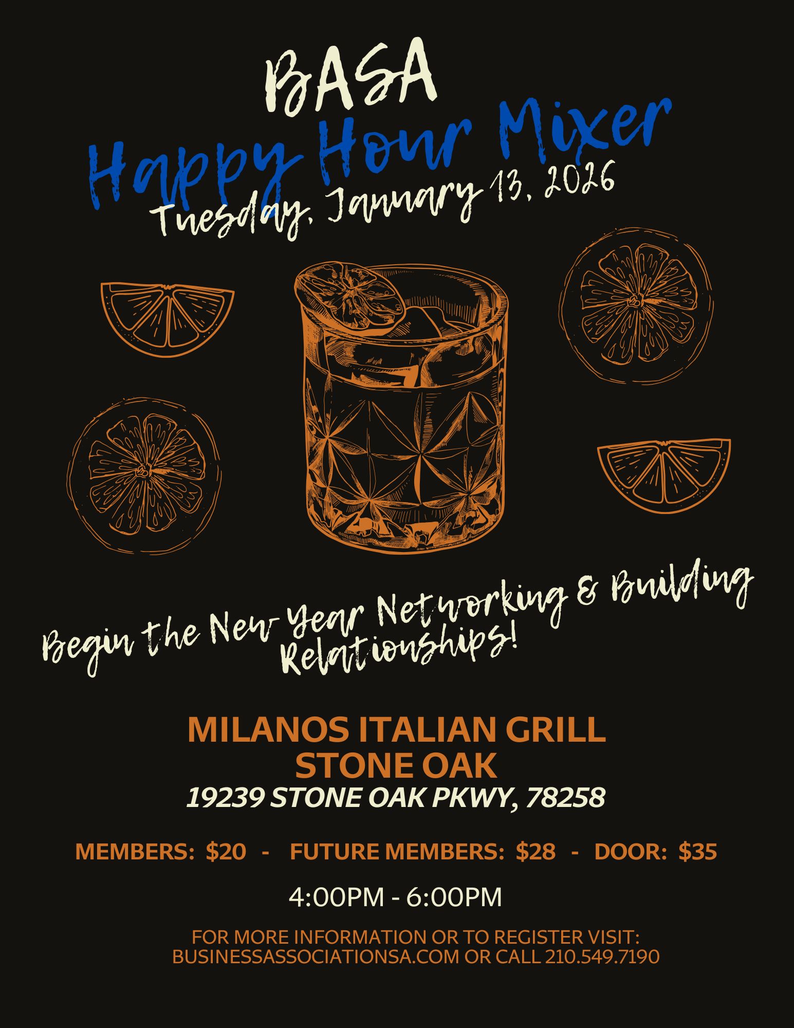 Kick off 2026 with meaningful connections! Join BASA for our first Happy Hour Mixer of the new year at Milanos Italian Grill in Stone Oak.