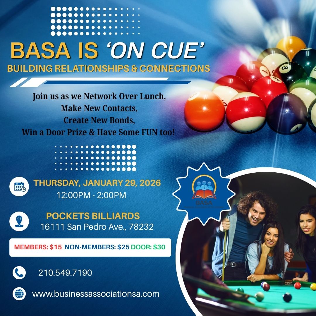 Tags: Pockets Billiards, pool networking, San Pedro events, business lunch, unique networking, billiards networking, BASA events, San Antonio networking, fun business events, casual networking