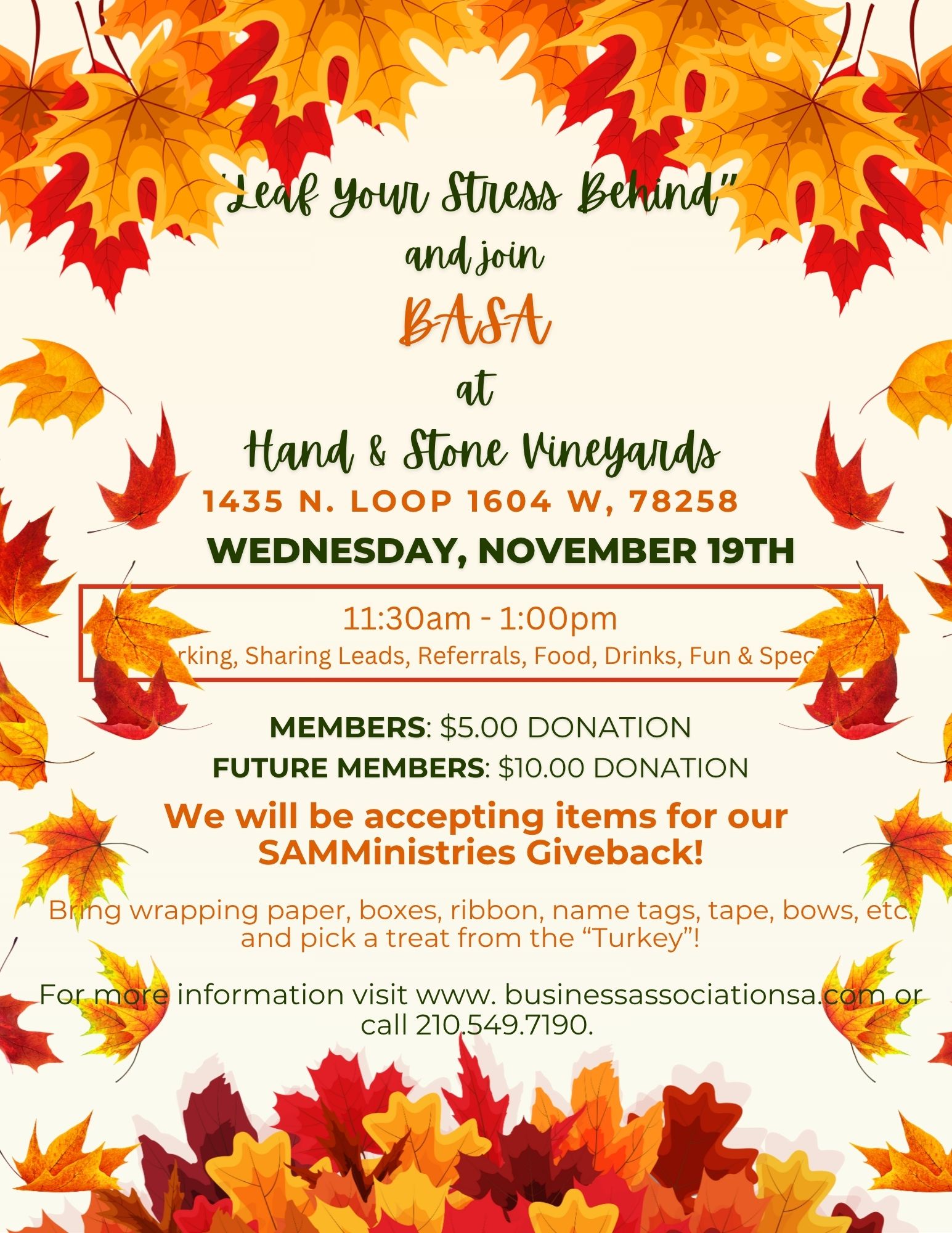 Leave your stress behind and join us for a meaningful networking event that combines business connections with community giving. Help us support SAMMinistries while enjoying wine, food, and fellowship!