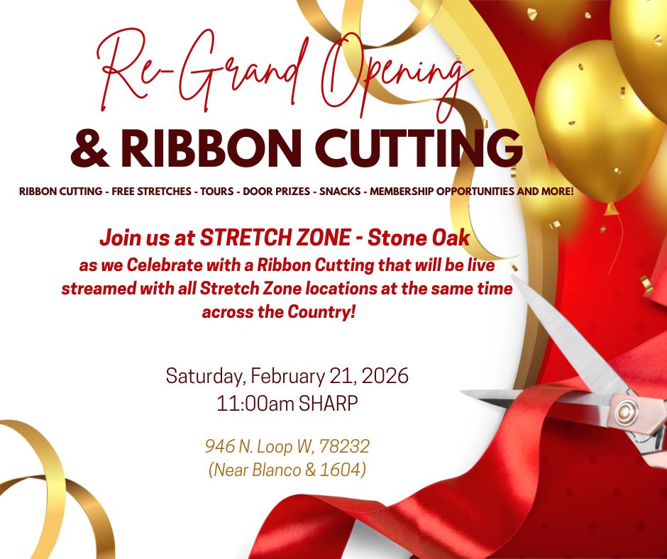 Experience the future of flexibility! Join us for the exciting Re-Grand Opening of STRETCH ZONE Stone Oak on 21 February 2026 at 11:00, featuring a special ribbon cutting ceremony that will be live-streamed simultaneously with Stretch Zone locations across the country. This is your exclusive opportunity to discover how practitioner-assisted stretching can transform your mobility and wellness.